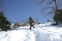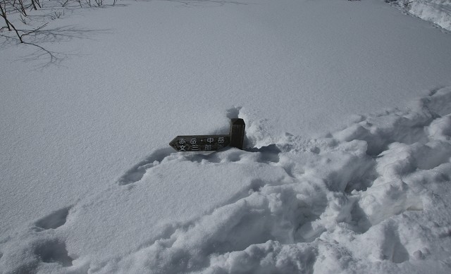 雪が深い道を緩やかに登ってきました。分岐を示す道しるべも殆ど雪に埋まっています。私たちは左へ、文三郎道を登って行きます。ここからが急登の始まりです。