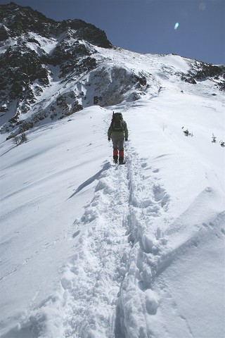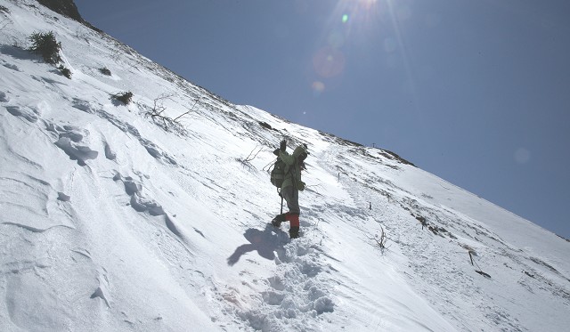 雪で覆われた急斜面を直登します。斜面では立つのもやっと、アキレス腱が切れそうです。