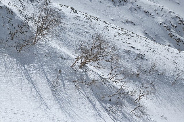 ダケカンバが真っ白な雪に影を落とします。秋に黄金色に輝いていた木々、今はじっと雪解けを待っているようです。