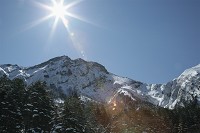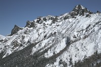 逆光に聳える赤岳です。いつものように凛々しい姿です。ここで、地蔵尾根と文三郎道、どちらを登るか迷いましたが、雪が深いことと、地蔵尾根への足跡が少ないことを考え、安全な文三郎道を上ることに決めました。