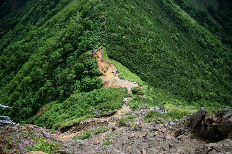 樹林帯を抜け花の咲く斜面のトラバースを行くと、阿弥陀岳と中岳とのコルへ出ます。ザックをデポして阿弥陀へ登ります。少し上がって下を見てみました。