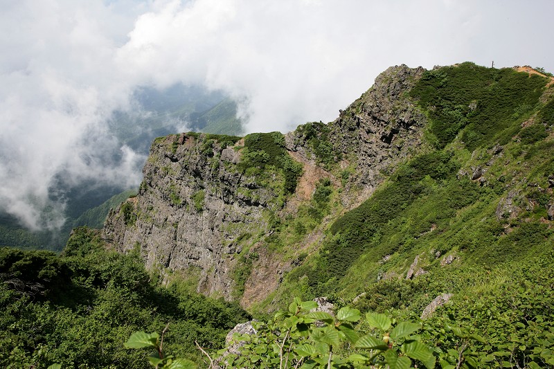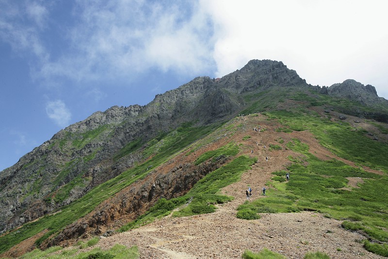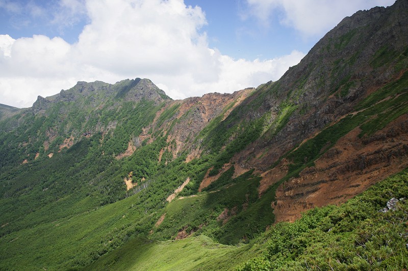 山頂を後に急斜面を中岳とのコルまで下りてきました。これから向かう中岳と赤岳が聳えています。ザックを担いで中岳へと登って行きます。