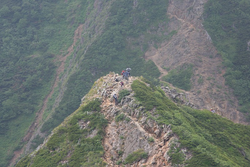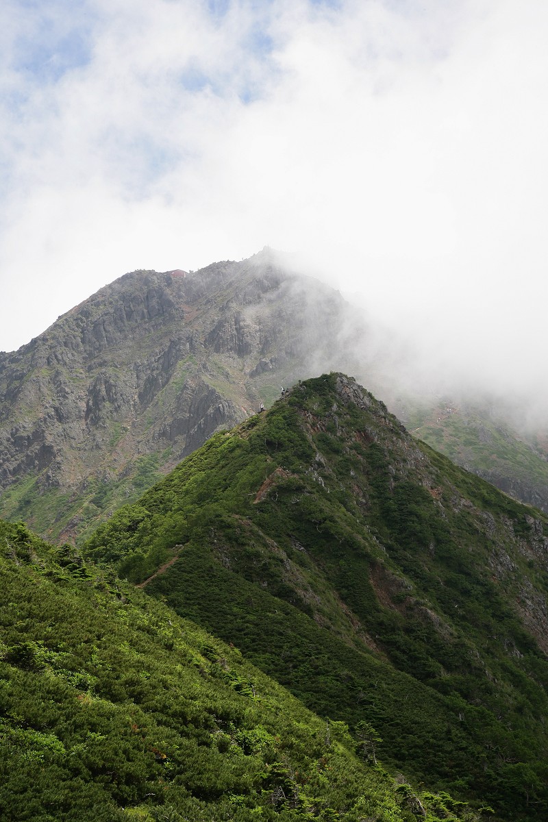 コルから、行者小屋から上がってくる文三郎道と赤岳の分岐まで登ってきました。振り返った中岳をズームして撮って見ました。山頂には絶えることなく登山者の姿がありました。