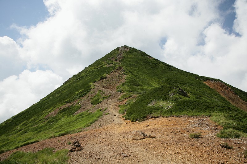山頂から中岳を下って、赤岳とのコルまで下りてきました。振り返って撮った中岳はきれいな三角形をしています。