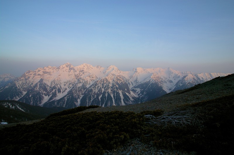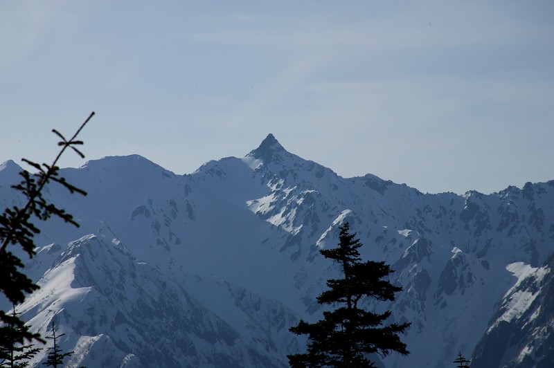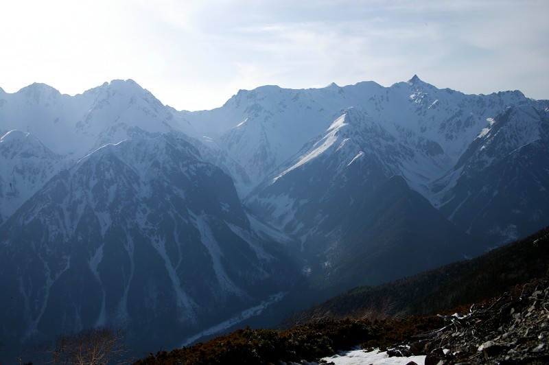 しばらく上ったり、下ったりを繰り返し、やっと樹林帯を抜けると、なんという展望でしょう。少し日が西に傾いた逆光にも穂高や槍の気高い姿です。