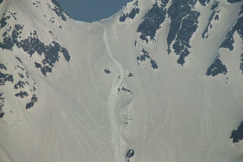 涸沢カールの底は見えませんが、登山者が辿った後が雪にはっきりと残って、上へと伸びています。登っていく登山者が黒い点になって写っています。