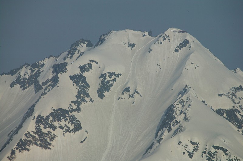 北穂高へのトレースもはっきりとわかります。二つある北穂のピーク、右が北穂高小屋のある北峰です。夏は左にある南稜を梯子や鎖で登る道を、雪の多いこの時期は下から直登のようです。