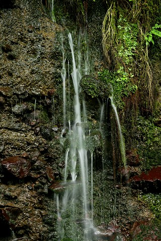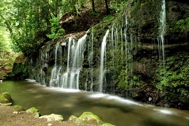 少し行くと、山肌から染み出るように流れ落ちる千条の滝があります。何日も雨が続いた後のためいつもより水量があります。