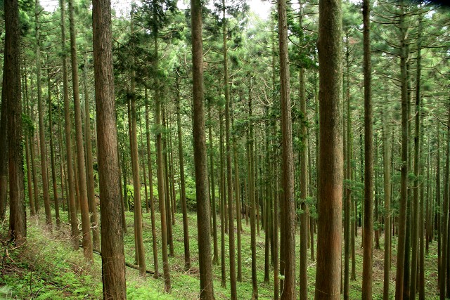薄暗い登山道をつづらに登って行きます。あたりは杉の木でしょうか、真っ直ぐに空に向かって立っています。
