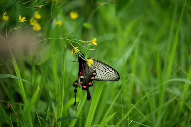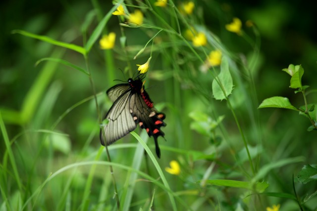 きれいな模様の羽を持つアゲハチョウです。数え切れないほど飛び交っていました。色が薄い羽の蝶、まだ羽化したばかりでしょうか。同じ模様を持つ黒い羽の蝶もたくさん飛んでいました。