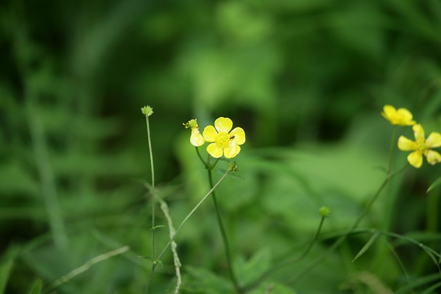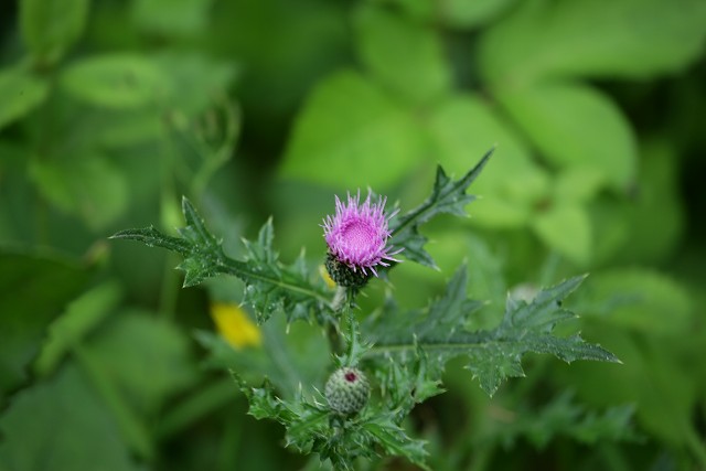 湯坂路のアジサイはまだ蕾が小さく、黄色で小さな花、二ガナが道をずっと飾っていましたけれど、時折このミツバツチグリやアザミが目を楽しませてくれました。