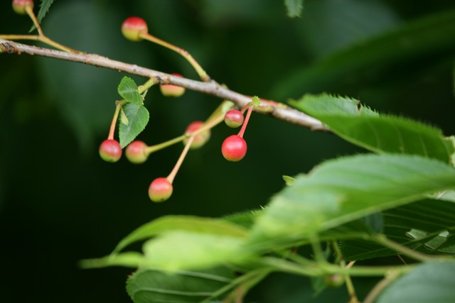 この湯坂路の両側にはたくさんのサクラの木があります。殆どは山サクラですけれど、もうすっかり葉を茂らせていました。よく見るとこのように赤い小さな実をつけていました。