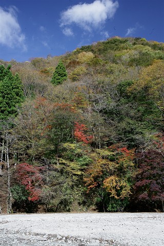少し行くと治水のための堤防があり階段を上がって広々とした川原に出ます。そこから付近の山肌は晩秋の色合いでした。