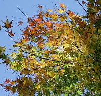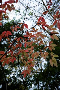 枝の先端付近の葉を赤く染めたモミジが目立ちます。西丹沢自然教室前の駐車場に車を止めて、つり橋を渡り、一歩足を山道に踏み入れると、