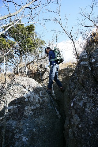 ゆっくり1時間半ほど登ると毛無山に着きました。そこから稜線を十二ヶ岳へ小さなアップダウンを12回繰り返して行きます。最初に現れた岩場、ほんの数メートルの下降です。