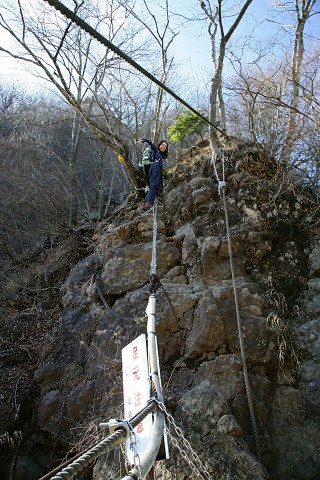 つり橋を渡ると山頂まで急な斜面が待っています。少し北側なので、太陽の光が届きません。地面には数日前の雪も薄っすらと残り、鎖や岩を掴む指先が凍りそうに冷たいので、手袋を二重にします。