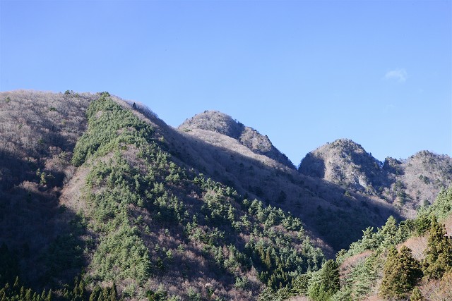 文化洞トンネル手前の集落へ下ってきました。振り返って見た十一ヶ岳(右)と十二ヶ岳(真ん中)です。登山口から毛無山まで1時間半、そこからアップダウンを1時間半で十二ヶ岳山頂へ、下りは頂から1時間でした。