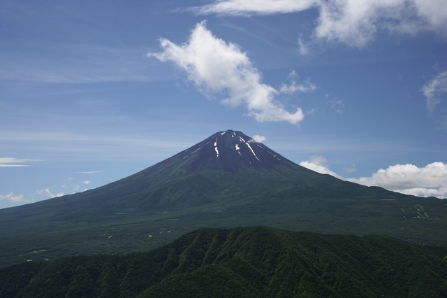 尾根道の着いた先は十二ヶ岳への稜線、毛無山頂です。真正面に大きく聳える富士山です。
