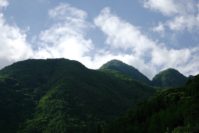 集落に下りてきて振り返りました。真ん中の一番高い山が十二ヶ岳、右が十一ヶ岳です。足慣らしのつもりで行った今回の山行でしたが、アップダウンの