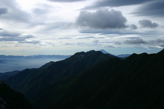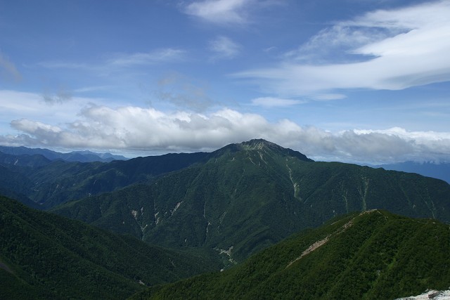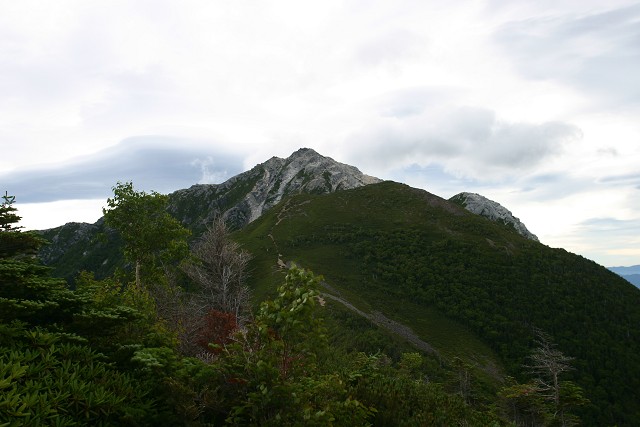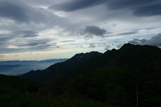 さらに登って行くと東側が開け、鳳凰三山を望むことができました。上空にはたくさんの雲があります。このような雲の時は天候に不安もあります。