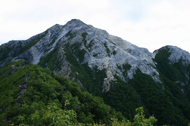 これから登る甲斐駒は白く美しい三角形をして登山者を迎えてくれます。駒津峰からはいったいどこを登るのだろうと不思議です。
