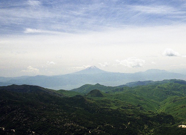 登山口から急登を登って行き、稜線に出るとまもなく大きな岩がごろごろした朝日岳の頂上に出ます。富士山まで見渡すことができる展望の良い頂です。