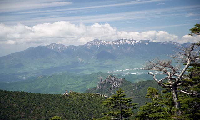 金峰山からは瑞牆山が眼下に見えています。その向こうにまだ雪を抱いている八ヶ岳も連なります。