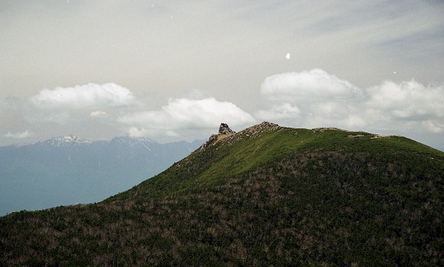 山頂に突然現れるこのような大きな岩、いくつも積まれた形です。しかも少し南にかしいでいます。この岩に挑戦する登山者も多くいます。