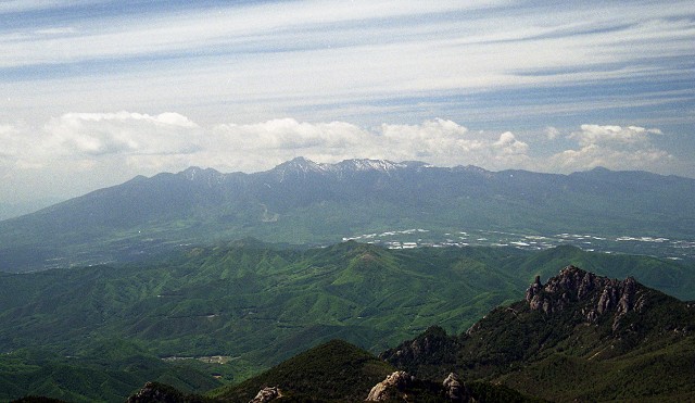 金峰山の向こうに八ヶ岳の連なる峰も見えています。真ん中のひときわ高いのが赤岳です。下の方に瑞牆山が見えています。
