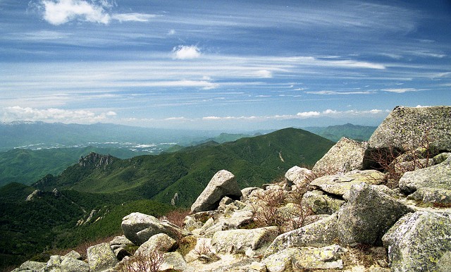 岩がごろごろした朝日岳の頂に出ます。そこから五丈岩のある金峰山を望むことができ、後少しで金峰山の頂上です。