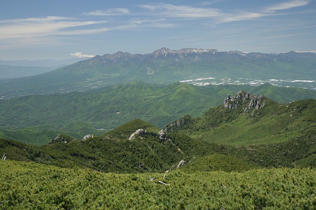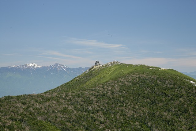 金峰へはさらに1時間、尾根道を進み、ハイマツ帯に出ると八ヶ岳と北アルプスの展望をお供にあっと言う間に山頂でした。