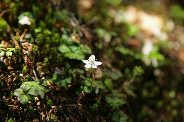 登山道脇の日陰に咲いていたミツバオウレン、いたるところに小さな一厘が、あるいは2.3厘が並んで咲いていました。