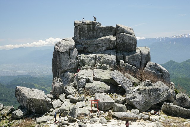 山頂にある五丈岩、大きな岩がバランスをとって重なっています。長い年月何故落ちないのか不思議です。いつ行っても、この岩のてっぺんに登っている人や挑戦する人がいて、見ているこちらが怖いこと。