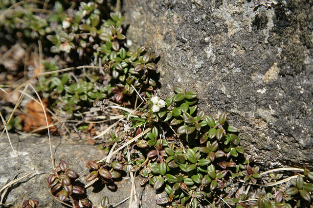 金峰山の山頂付近は大きな岩がゴロゴロ重なっています。岩陰に這うように葉を広げて、小さなコメバツガザクラが咲いていました。