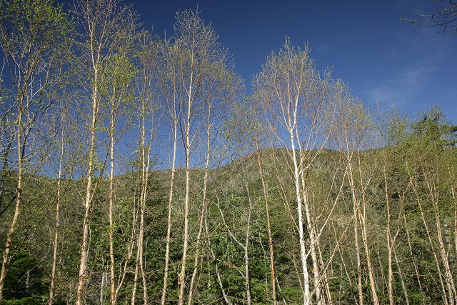 大弛峠を後に、車で舗装された林道を下って行きます。林道はずっとシラカバとカラマツの新緑に彩られていました。