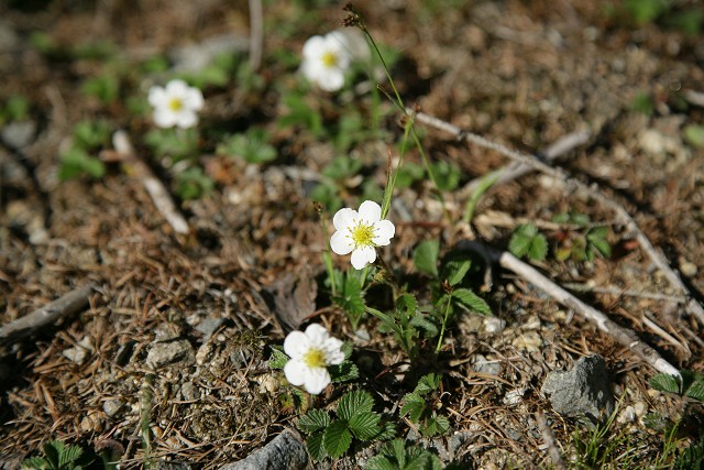 林道を下って行くと、突然、左斜面の白いものが目に飛び込んできました。車を止めて見ると、シロバナヘビイチゴが群生していました。