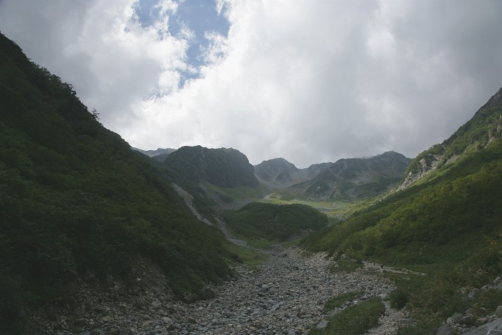 上高地から長い道程を横尾、槍沢ロッジと越えてきました。テント場のババ平で休憩、水を補給し、緩やかに登ってきました。登山道が大きく左に曲がる大曲り付近です。ここから傾斜が増した道を、天狗原への分岐を目指します。