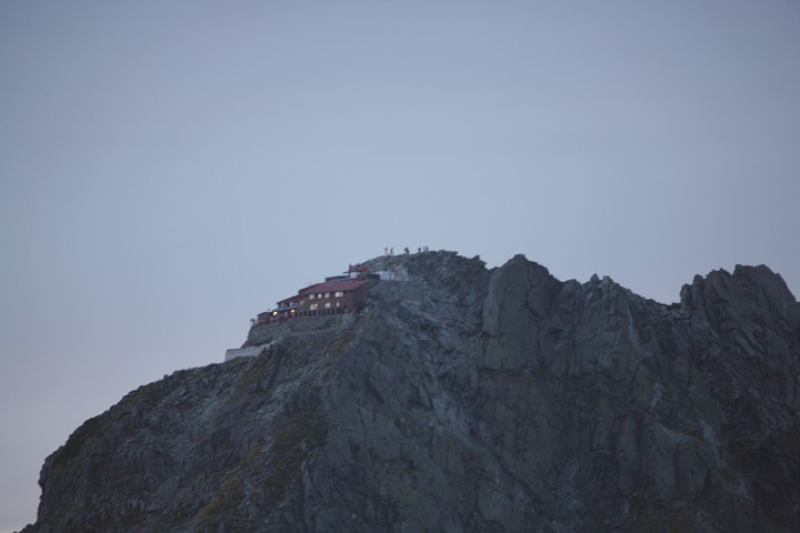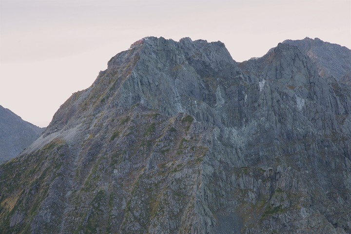 縦走路は長谷川ピークを超えて、滝谷を見下ろす飛騨泣きと呼ばれる岩場に続き、その先、北穂高山頂に建つ北穂高小屋に続きます。朝の小屋を望遠で撮りました。山頂に登山者がいます。