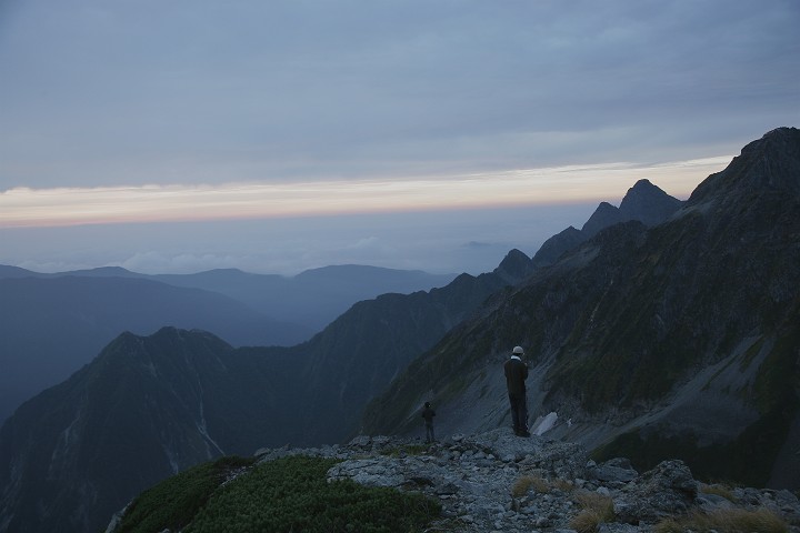 南岳小屋から少し上がった獅子鼻から、夕闇のガスの中に浮かび上がる北穂高を眺め、夕食後、大キレット通過を楽しみに眠りにつきました。翌朝は雲が多くご来光が遅かったのですが、風のない穏やかな朝を迎えました。絶好のキレット通過日和です。小屋の東側、常念平に行くと、前日苦労をして登った横尾尾根とその向こうに東鎌尾根を従えた槍の頭が聳えていました。