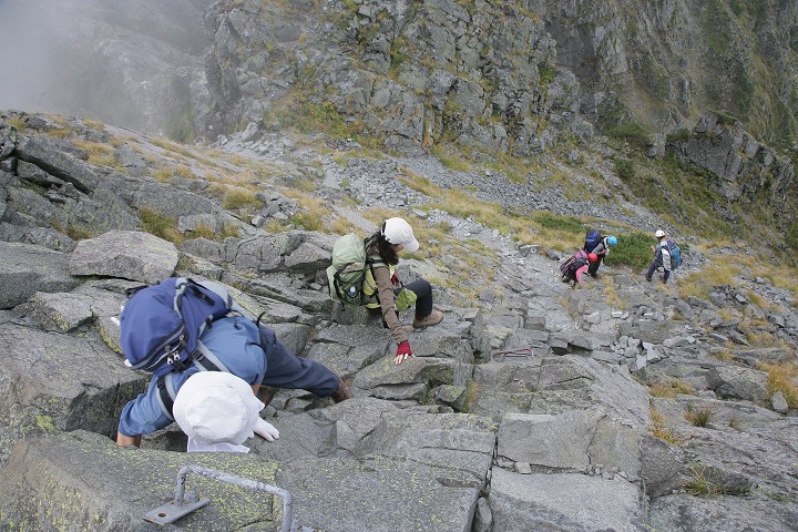 まだまだ岩場を登って行きます。滝谷側に回りこむといよいよ飛騨泣きです。