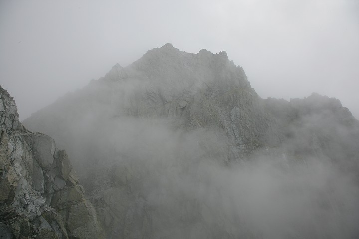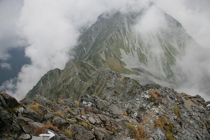 北穂高小屋横から、ガスが晴れる瞬間を待ってキレットを撮りました。