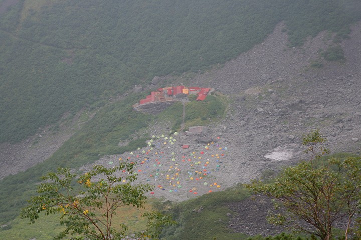 北穂高を後に涸沢に下ります。だいぶ下ってきました。カールの底に涸沢ヒュッテとテント村が見えています。