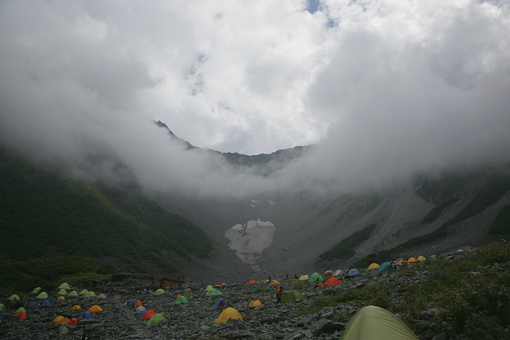 涸沢カールのテント場まで下りてきました。振り返るとちょうどガスの中から姿を見せてくれたつり尾根です。この景色を目に焼き付けて横尾に向けて下山しました。