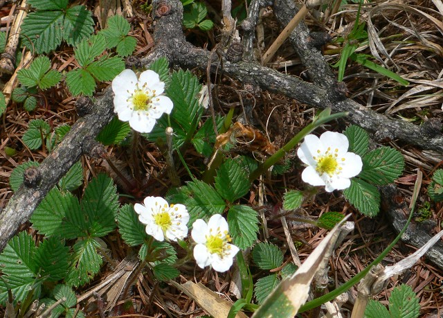 登山道はずっとシロバナヘビイチゴに彩られていました。笹の葉に隠れるように登山道脇に咲いていたり、広いところでは群生していました。
