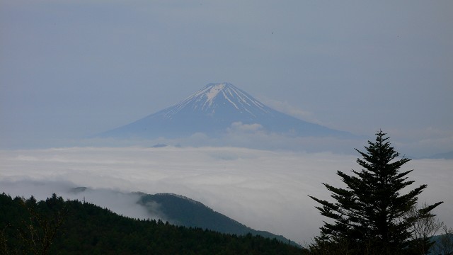 美しい白樺や落葉松の新緑を楽しみながら、少し登って行くと、展望が一段と開けた小金沢山に着きました。ここからも雲海と美しい富士の展望でした。