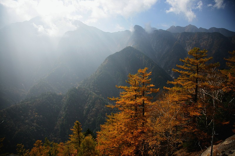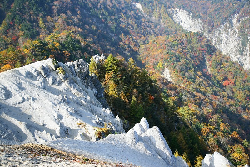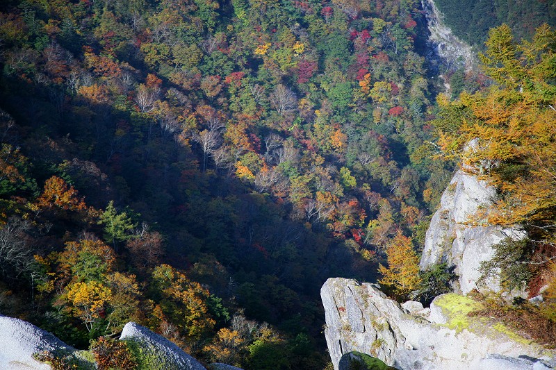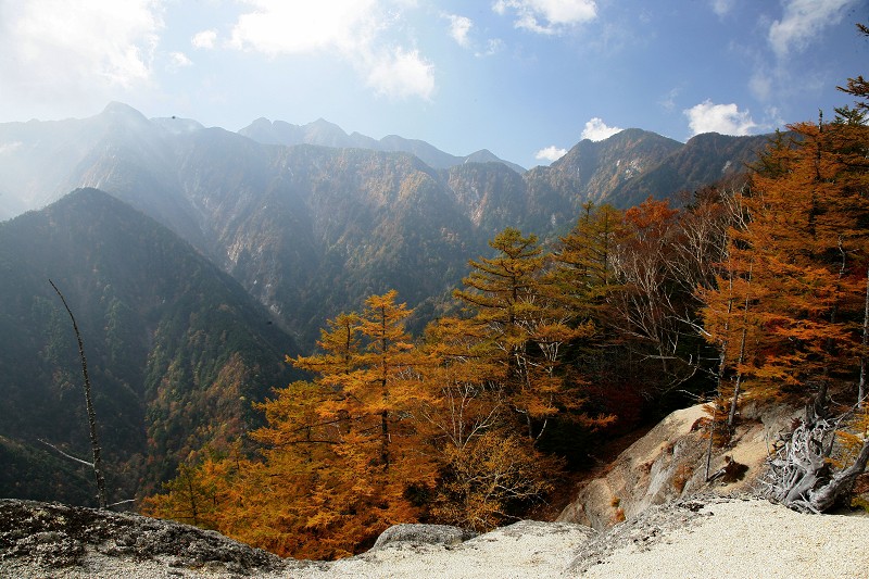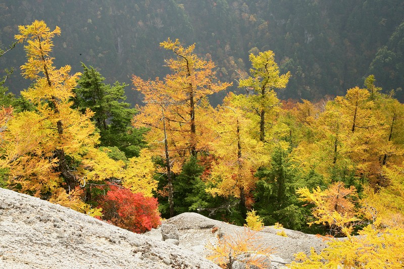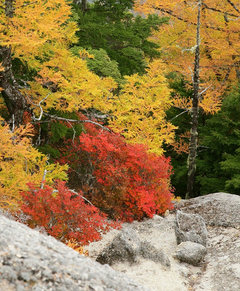この付近のカラマツの黄葉は今が盛りでした。太陽の光に黄金色に輝いて、ところどころにあるドウダンツツジの赤と深い緑、真っ白な岩、ほんとうに美しい景色でした。