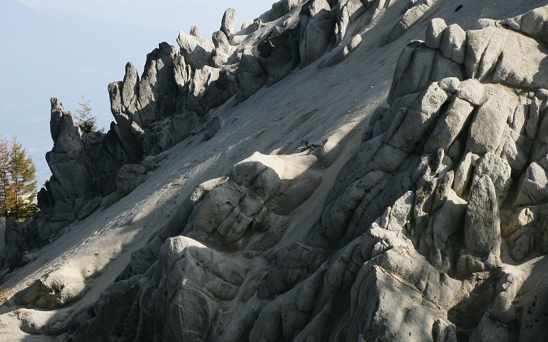 この雁ヶ原はもろい花崗岩が崩落している斜面で、面白い形の岩があちこちに残っています。真っ白な砂と岩と山肌の紅葉のコントラストがすばらしく、しばらく時間の経つのを忘れて眺めてしまいました。