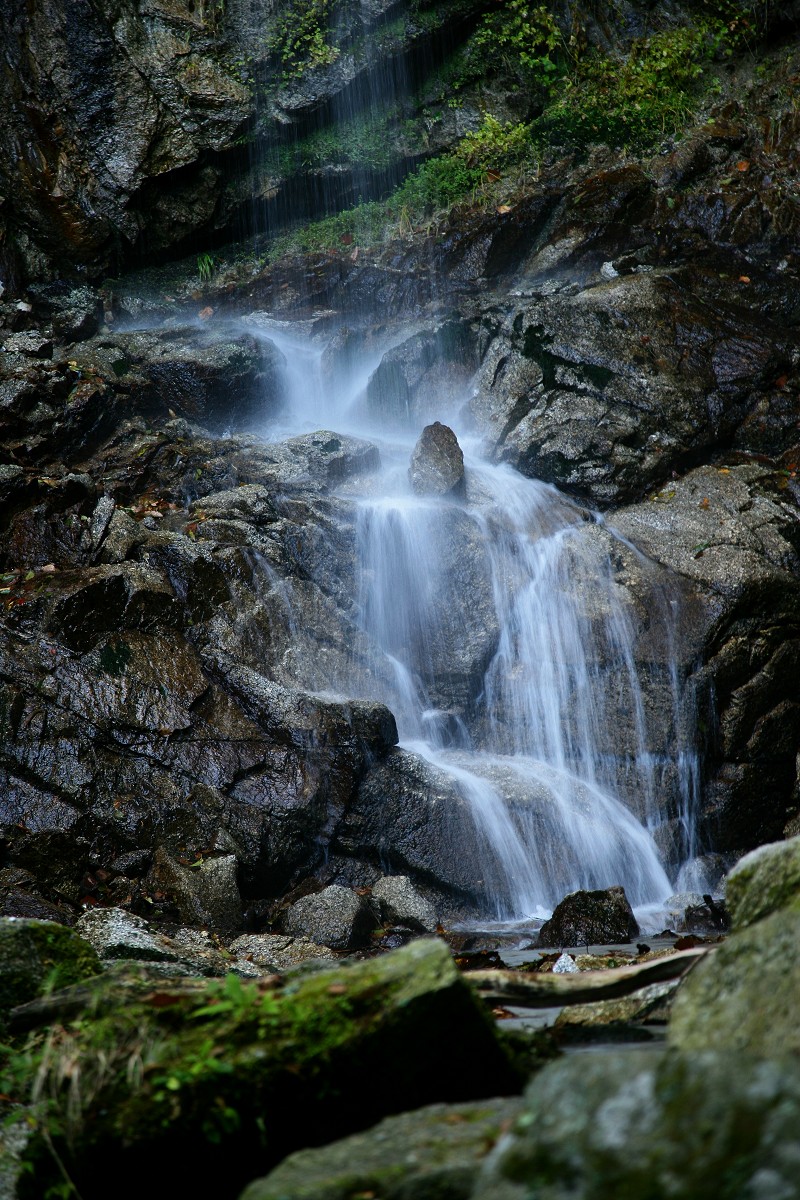 展望台でゆっくり至福のひとときを過ごした後は、また急な斜面を下ったり登ったり、そして延々と下って、日向山雁ヶ原下の林道への分岐まで戻ってきました。そこからまた急な斜面を下ると車を止めている矢立石へ通じる林道へ出ます。林道の脇に、糸のように滑らかに岩を滑り落ちる錦滝がありました。