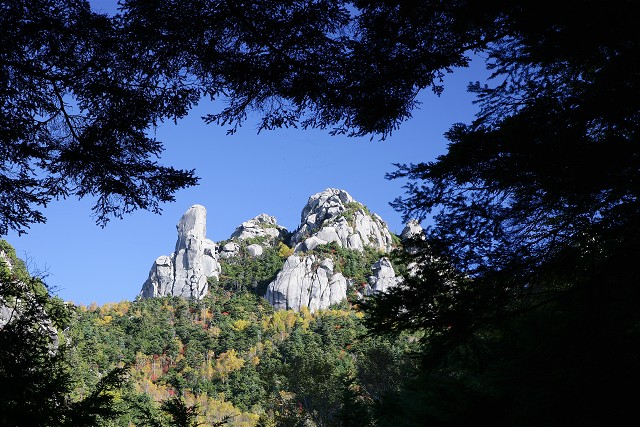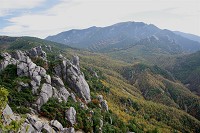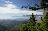 山頂からすぐ目前の金峰山です。頂にある五丈岩が傾いています。