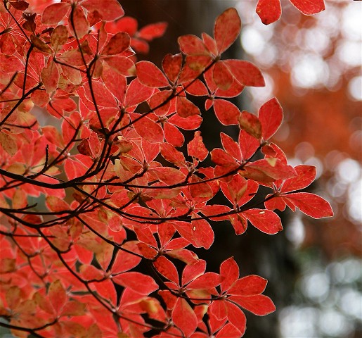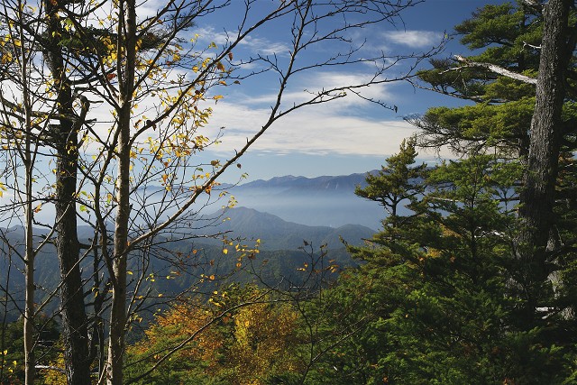 展望を堪能したら登った同じ道を下ってきました。登山口近くの林です。ずっと赤や黄に彩られた道でした。